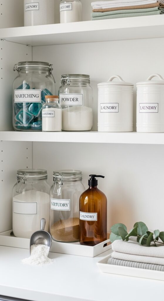 What makes it work: Matching containers remove the visual noise of bright branded packaging, which is one of the simplest ways to make laundry room decor look calmer. Glass and ceramic also add a cleaner, more tactile finish than plastic bottles.
