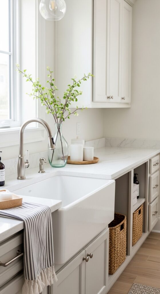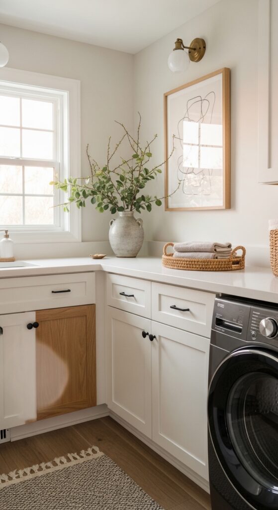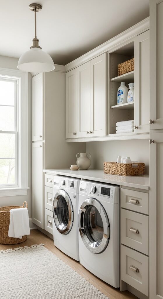 Clean and organized laundry room ideas feel timeless because they’re built on clarity, order, and visual breathing room. Instead of heavy ornament or trend-driven clutter, this look relies on good storage, edited surfaces, and materials that feel fresh every time you walk in. It’s practical, but it still feels styled.