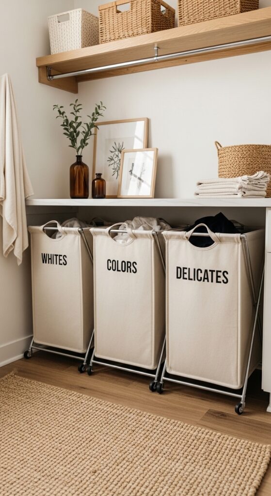 How to achieve it: Use a three-bin canvas sorter labeled whites, colors, and delicates, or adapt the labels to your household’s routine. Tuck it beneath a shelf or counter so it feels integrated into the room rather than floating awkwardly.
