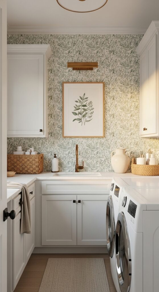 How to achieve it: Choose a small-scale pattern in sage, taupe, or muted blue so it doesn’t overwhelm a tight room. Peel-and-stick wallpaper works well behind shelves or on the wall opposite the machines for a quick visual focal point.