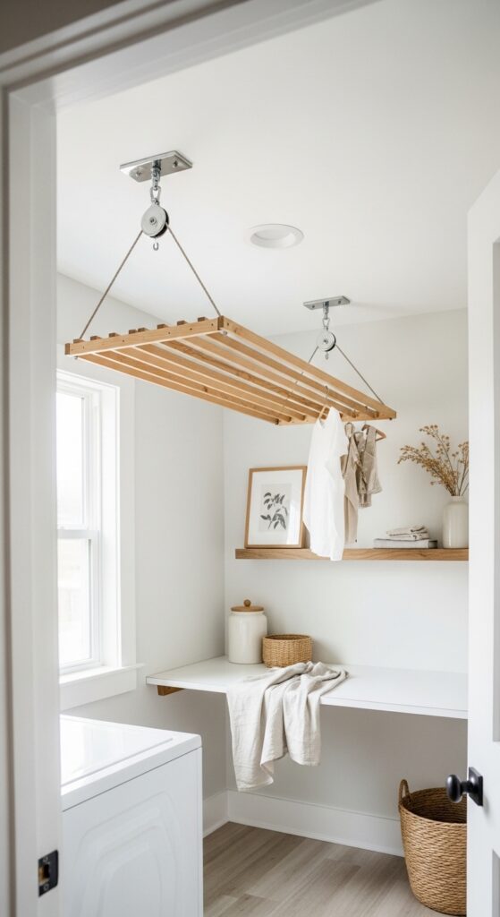How to achieve it: Look for a pulley rack or ceiling-hung bar system that can be raised when not in use. Install it above open floor area, not directly over the washer, so you can hang delicate items without disrupting the workflow.