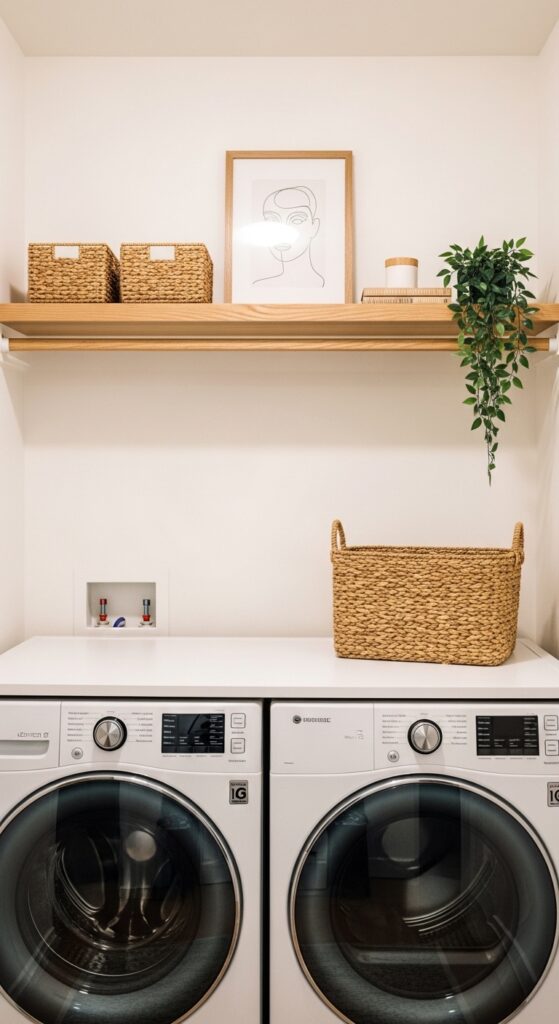How to achieve it: Limit the shelf to three categories: one basket, one practical container, and one decorative object like framed art or greenery. Keep at least one-third of the shelf visibly empty so the room maintains that edited laundry room aesthetic.