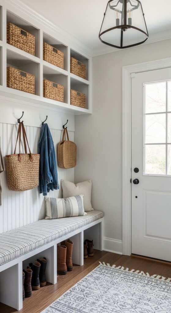 How to achieve it: Use durable finishes like satin paint, washable cushion fabric, and beadboard or shiplap behind the bench. Keep one basket per family member in the cubbies so clutter is sorted the moment it comes in.