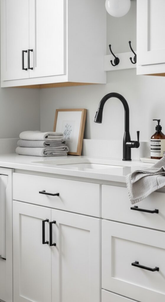 What makes it work: Dark hardware outlines cabinetry and gives pale surfaces definition, which helps the room feel more designed. In a utility space, that contrast creates visual structure without adding clutter or color noise.