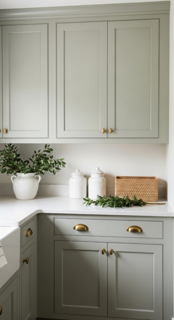 How to achieve it: Choose a gray-green paint like Farrow & Ball Mizzle or a similar sage with low saturation. Pair it with warm white walls and pale counters so the color feels soft, not heavy.