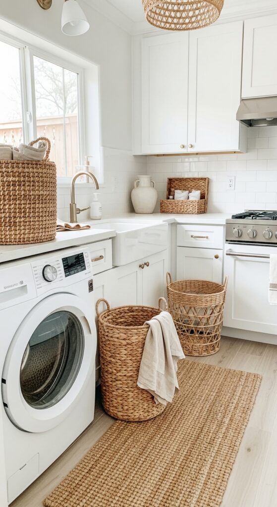 What makes it work: Laundry rooms are full of glossy, hard surfaces, so woven fibers create much-needed contrast. That mix of smooth and tactile materials is what gives organized spaces warmth instead of making them feel clinical.