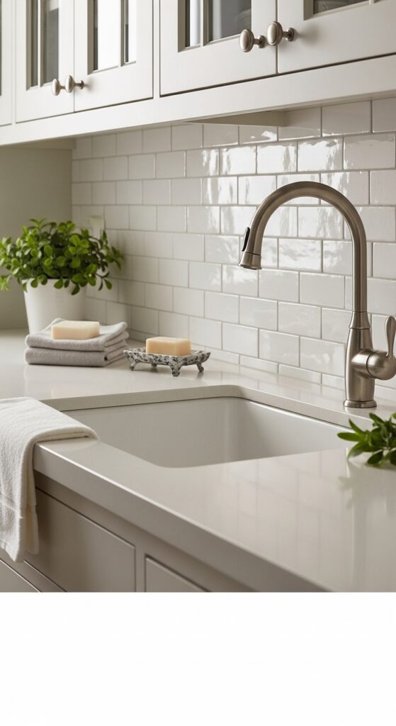 How to achieve it: Use classic subway tile, narrow stacked tile, or soft zellige-look porcelain in warm white or ivory. Extend it only behind the sink or counter section for impact without paying to tile the whole room.