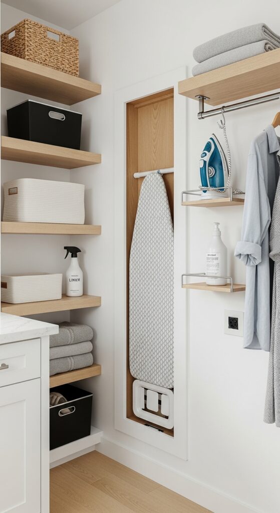 💡 If built-ins aren’t possible, a wall-mounted over-door ironing board gives a similar space-saving effect.