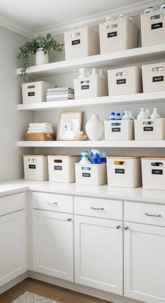 What makes it work: Uniform bins simplify what the eye sees, even when the contents vary wildly. That visual consistency is one of the strongest tricks behind clean organized laundry room ideas because it reduces the appearance of excess.