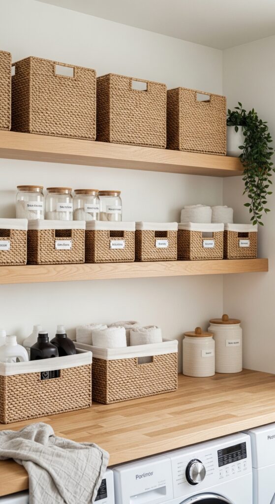 How to achieve it: Install white oak or painted wood shelves and use identical baskets for categories like stain removers, dryer sheets, and spare cloths. Add simple label tags so the shelves stay functional instead of turning into decorative clutter.