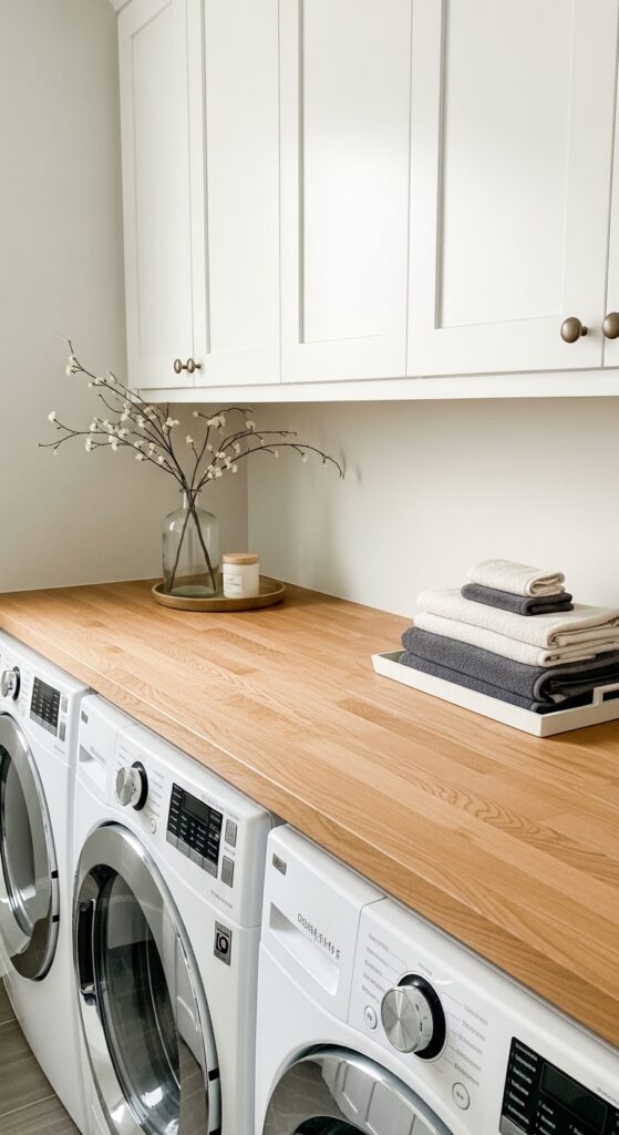 How to achieve it: Use sealed oak or maple butcher block at least 1.5 inches thick and finish it with a water-resistant matte polyurethane. Keep the counter depth aligned with the machines so socks, baskets, and folded piles have a proper landing zone.