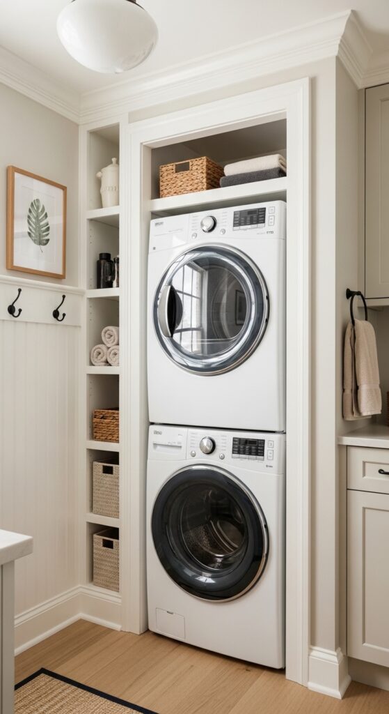 How to achieve it: Frame the appliances with side panels or wall trim and leave enough manufacturer-recommended clearance for airflow and servicing. Use the extra side space for narrow shelves, hooks, or a slim hamper tower.