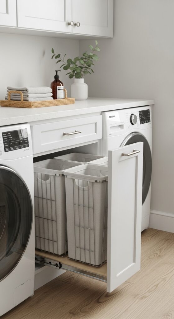 How to achieve it: Add pull-out wire or canvas hamper inserts inside a 15- to 18-inch base cabinet. Separate lights, darks, or delicates from the start so sorting becomes part of the room design instead of an extra step.