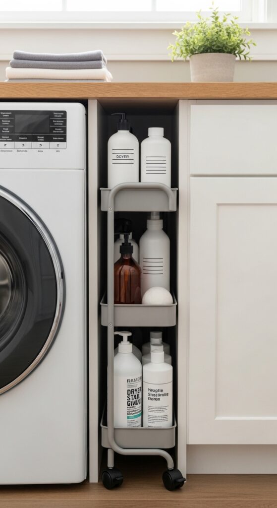 How to achieve it: Measure the gap exactly and look for a rolling cart under 8 inches wide with raised edges to keep products upright. Use it only for tall bottles, dryer balls, or stain treatments so the shelves don’t become a catch-all.