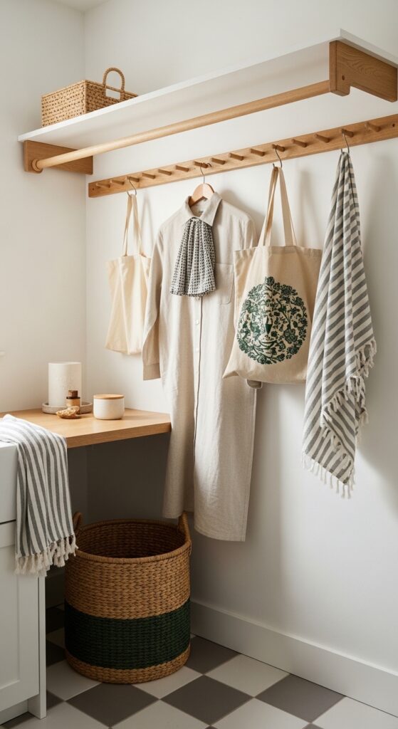 How to achieve it: Mount a solid wood rail high enough to clear hanging shirts and use a mix of pegs and S-hooks. Keep only a few pieces visible at once so the station reads as intentional rather than crowded.