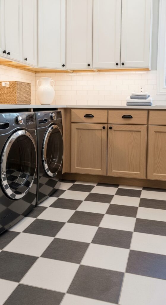 What makes it work: Checkerboard flooring adds movement at the base of the room, which is ideal when walls and cabinetry stay simple. Because the pattern is geometric and classic, it still supports a clean organized home instead of competing with it.