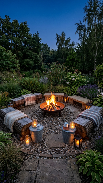 Vibe sentence: A fire pit circle at dusk, with log benches draped in wool throws and the smell of woodsmoke in the autumn air, is the rustic outdoor experience at its most complete and unforgettable.