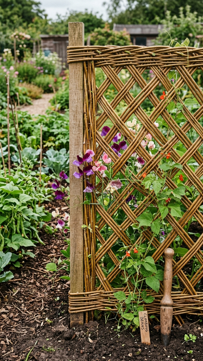 How to achieve it: Ready-made woven willow hurdle panels are available from garden suppliers and country craft markets in standard 6-foot sections — no construction required. Push the stake ends 6–8 inches into soft ground for stability, or wire to existing posts. Living willow panels are also available: plant in late winter, weave young rods as they grow, and within one season you have a growing, living structure that remains permanently in leaf.