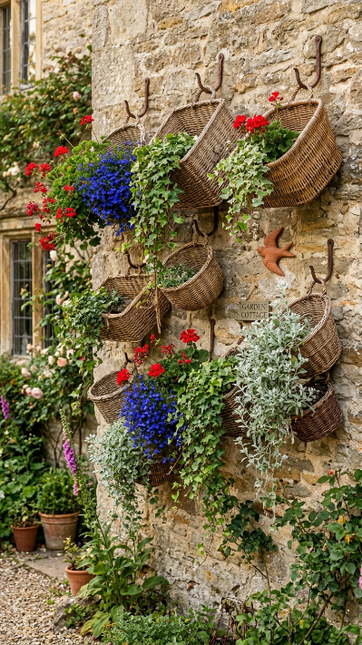 Vibe sentence: A wall of flowering wicker baskets transforms a bare stone surface into a vertical garden that tumbles with color all summer long.