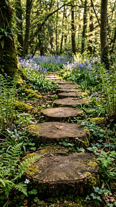 How to achieve it: Source large log slices from tree surgeons after storms — they’re often available free or at minimal cost. Choose dense hardwoods (oak, elm, sweet chestnut) which resist rot far longer than softwoods. Treat the underside with preservative before setting 2–3 inches into the ground, and top-dress the surface with a thin slurry of natural yogurt to encourage moss establishment in shaded conditions.