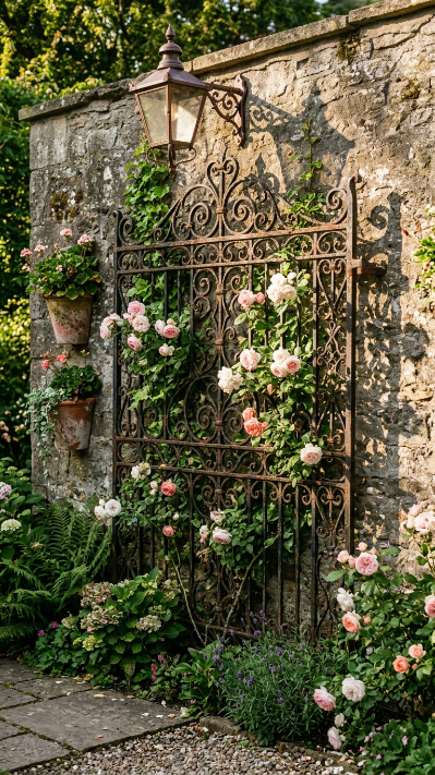 How to achieve it: Source Victorian or Edwardian iron gates from architectural salvage dealers, estate auctions, or specialist dealers like Salvoweb. Mount flat against a wall using heavy-duty masonry anchors at the top and securing points. Do not repaint — the existing patina is the aesthetic. Train climbing roses or clematis at the base and allow them to thread through the bars over one or two growing seasons.