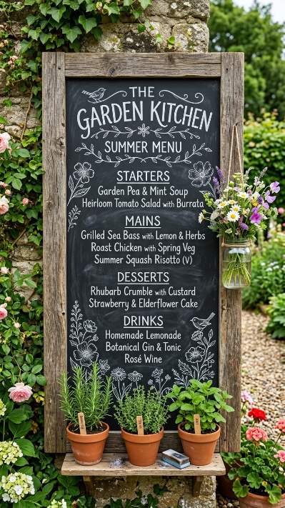 What makes it work: Chalkboard surfaces offer maximum personality with minimum effort — the hand-lettered imperfection reads as genuinely human and warm in a way that printed signage cannot replicate. Framed in reclaimed wood, the piece anchors a garden corner or patio wall with a defined focal point and invites seasonal updating.