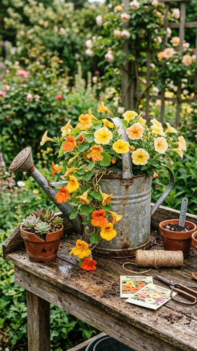 What makes it work: The watering can’s spout creates an irresistible visual opportunity — positioning trailing nasturtiums or petunias so they appear to “pour” from the spout is a classic cottage garden trick that always earns a second look. The worn galvanized metal provides a neutral foil that makes warm orange or yellow blooms glow particularly vibrantly.