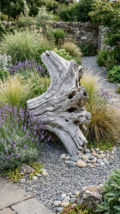What makes it work: Driftwood’s bleached, sculptural quality introduces an organic architectural form that acts as a focal point without competing with planting. Its smooth, wave-worn texture contrasts beautifully with rough gravel and fine ornamental grass blades. Because it’s found rather than bought, it carries an authenticity that no manufactured garden ornament can replicate.