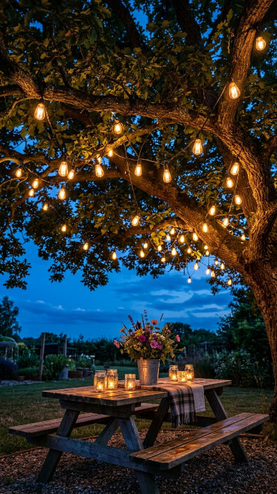 Vibe sentence: Edison bulbs strung through tree branches at twilight create the most enchanting outdoor room ceiling imaginable — the kind of light that makes everyone look beautiful and every conversation feel important.