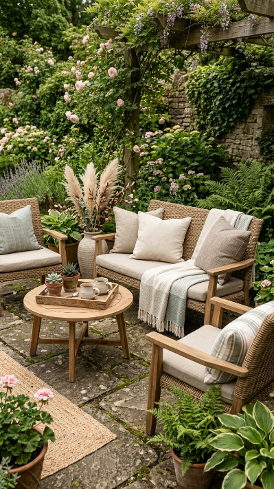 How to achieve it: Look for rattan or wicker sets with powder-coated steel frames rather than solid wicker construction — they weather far better and last many more seasons. Dress cushions in Sunbrella fabric in colors like warm flax, sandy beige, or terracotta — these fade-resistant fabrics feel like linen but withstand outdoor conditions. Add a hand-woven cotton throw for cooler evenings.