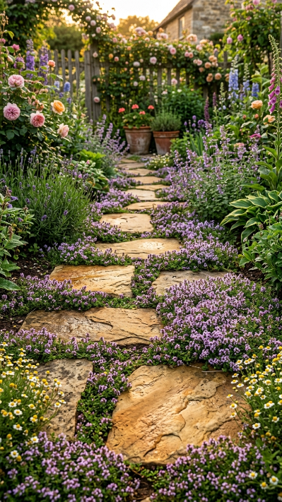 What makes it work: Creeping thyme softens the hard geometry of stepping stones in a way that gravel or bare soil cannot — the organic spreading habit blurs the line between structure and planting, which is central to the rustic garden aesthetic. The tiny purple flowers in bloom add a delicate color pop against warm stone tones.
