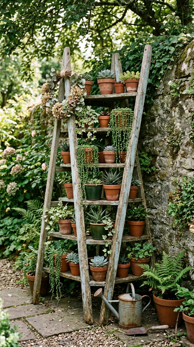 Vibe sentence: A weathered orchard ladder turned plant display is pure rustic poetry — it brings vertical layering to a garden without a single nail in the wall.
