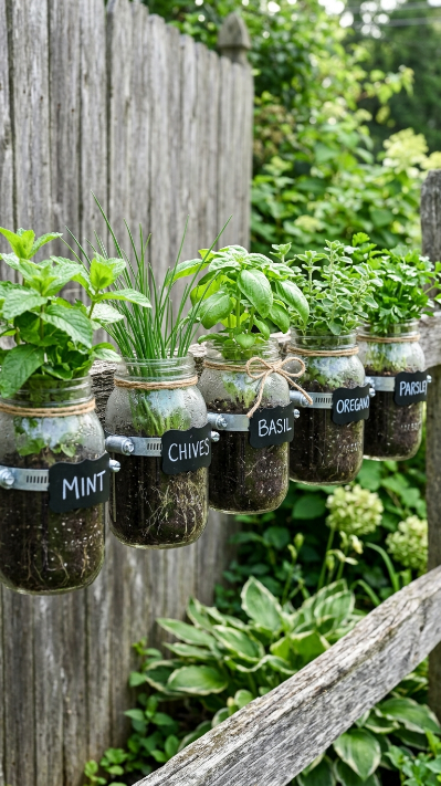 Vibe sentence: A row of mason jars bursting with fresh herbs along a fence rail is the most charming fusion of function and rustic aesthetics you can achieve in ten minutes.