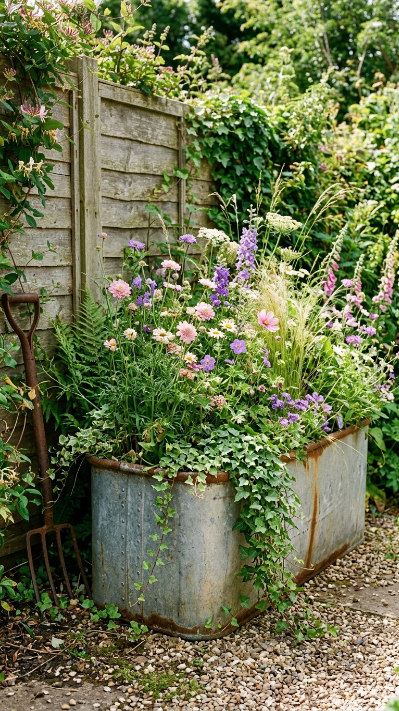 Vibe sentence: A galvanized metal trough brimming with wildflowers feels like a piece of working farm history repurposed for pure beauty.