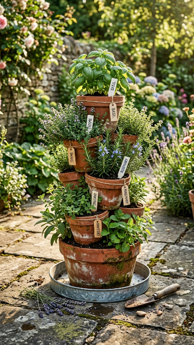 How to achieve it: Stack three graduated unglazed terracotta pots — 14″, 10″, and 6″ work beautifully — using a central stake to keep them stable. Choose herbs with different leaf textures and trailing habits. To age new pots quickly, paint them with plain yogurt and place in a shaded, damp spot for two weeks — moss will begin to form naturally.