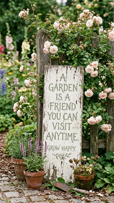 Vibe sentence: A hand-lettered sign propped against a climbing rose fence is the kind of detail that stops a garden visitor mid-step and makes them smile.