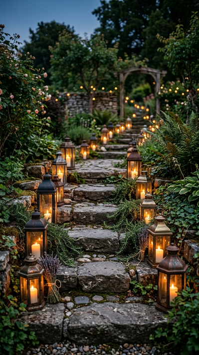 Vibe sentence: A cluster of mismatched vintage lanterns at dusk transforms ordinary garden steps into something that feels borrowed from a Provençal farmhouse.