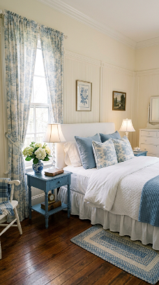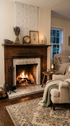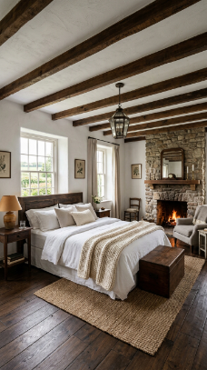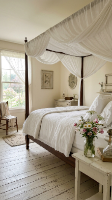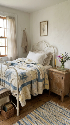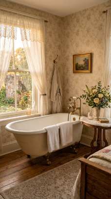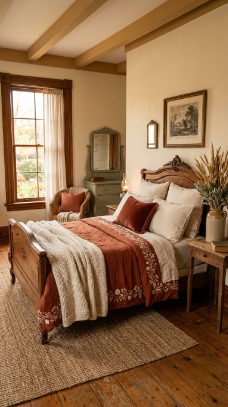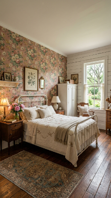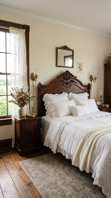 Think carved wooden headboards draped in linen, floral wallpaper softened by candlelight, and antique furniture tucked beside cozy quilts. It’s a style that whispers rather than shouts.