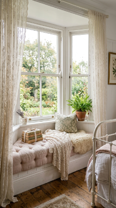 A tufted window seat framed by delicate lace is pure Victorian poetry.
