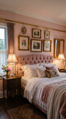 Soft blush walls trimmed in gold feel delicately Victorian and utterly feminine.