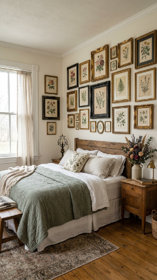 A curated mix of vintage botanical frames adds timeless Victorian personality.