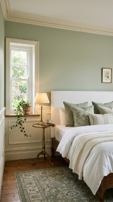 Muted sage paired with crisp cream trim is quietly sophisticated and deeply serene.