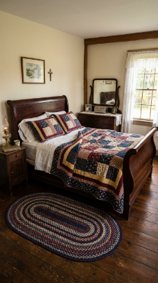 A heirloom patchwork quilt tossed over a sleigh bed is warmth made visible.
