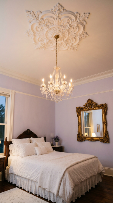 An ornate ceiling medallion with a crystal chandelier is effortlessly grand.