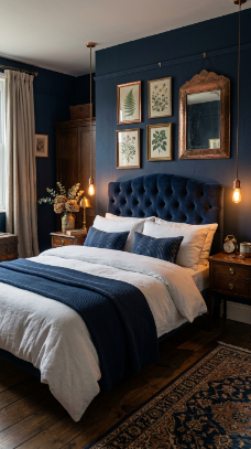 A rich navy bedroom warmed with copper accents feels deeply Victorian and bold.