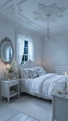An all-white room touched with silver feels like sleeping inside a full moon.