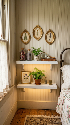 Delicate pressed botanicals framed and shelved bring a Victorian naturalist touch.