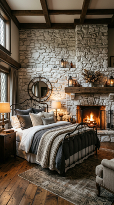 A textured stacked stone wall behind the bed brings rustic Victorian drama.