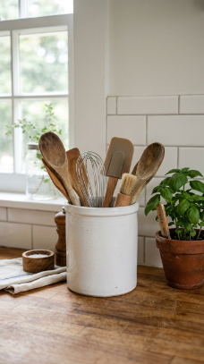 A wide white ceramic utensil holder filled with wooden spoons, a whisk and a spatula on the kitchen counter is farmhouse kitchen styling that is completely functional.