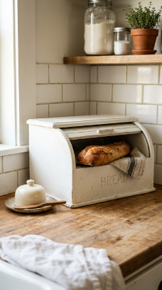 A classic wooden bread box in white painted or natural wood finish keeps bread fresh while adding genuine farmhouse kitchen counter charm.
